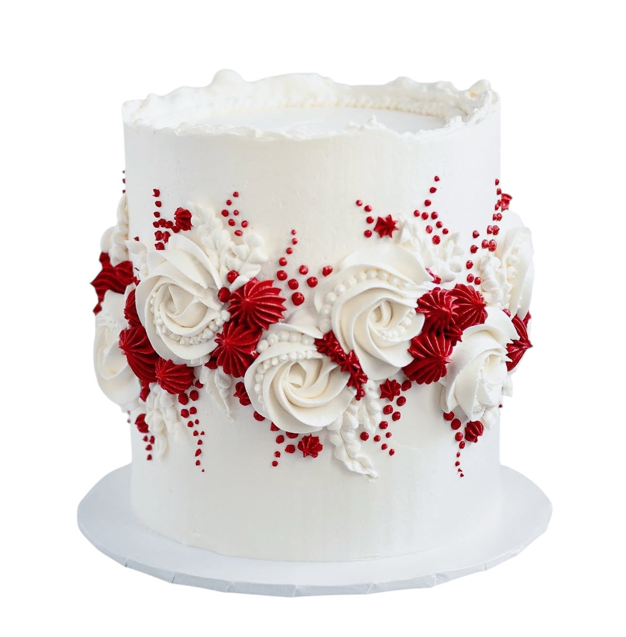 Celebrate the season with our decadent three-layered of freshly baked Red Velvet cake, surrounded by smooth creamy vanilla buttercream frosting. The cake is elegantly adorned with delicate vanilla rosettes that wrap around the center, accented by vibrant red dallops that add a festive pop of colour. This traditional red and white cake is as beautiful as it is delicious, perfect for making your holiday gatherings extra special.