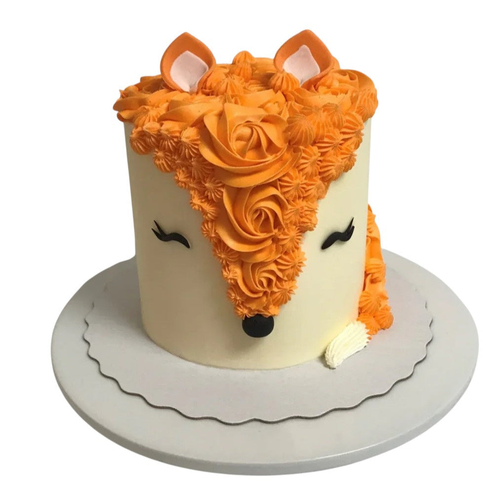 Finley Fox is a delightful 6-inch, three-layer cake of your choice, covered in smooth vanilla buttercream. This charming cake features fondant eyes, a small nose, and ears, all accented with a vibrant orange. Finley's fluffy tail is beautifully crafted from swirls of orange buttercream, adding a playful and textured finish to this woodland-inspired treat.
