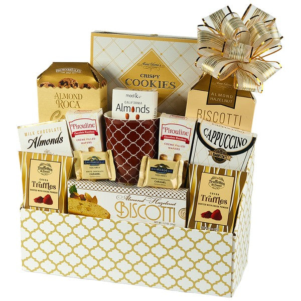 Description: 14 items: Ghirardelli White Choc Caramel 15g (2 pcs), Brown & Haley Almond Roca Cookies 57g, Truffettes de France Truffles 15g (2 pcs), Aunt Gloria’s Sugar Cookies 120g, Snacktales Almonds 18g, Aunt Gloria’s Mini Biscotti 57g, Snacktales Choc Almonds 57g, Pirouline Choc Wafers 25g (2 pcs), Barista’s Best Cappuccino 28g, Comfort Collection Biscotti 35g, Brown Mug 17oz.